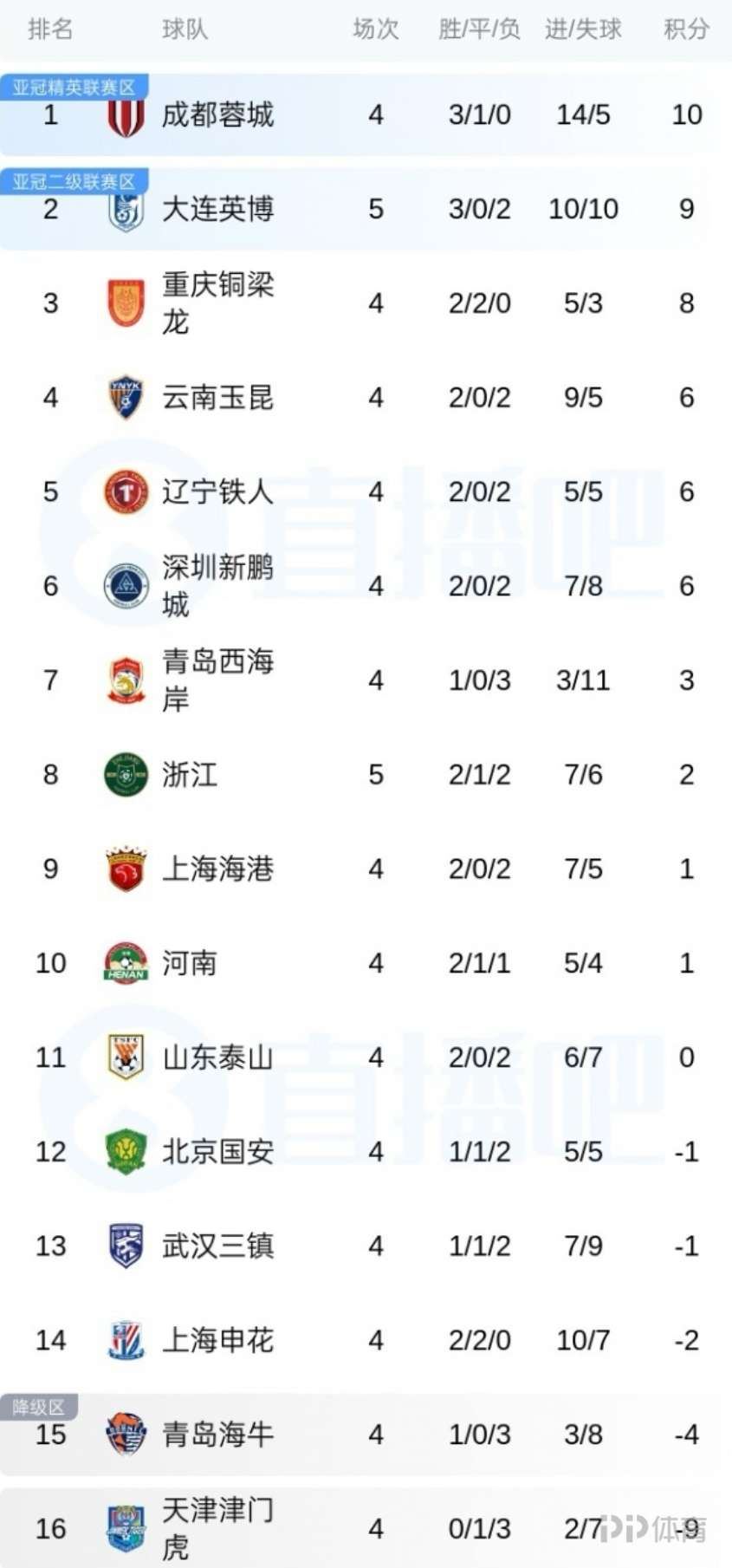 中超第5轮今日先赛一场,英博3-0完胜浙江,积分榜上英博先赛距榜首1分,浙江仍积2分暂排第8位。