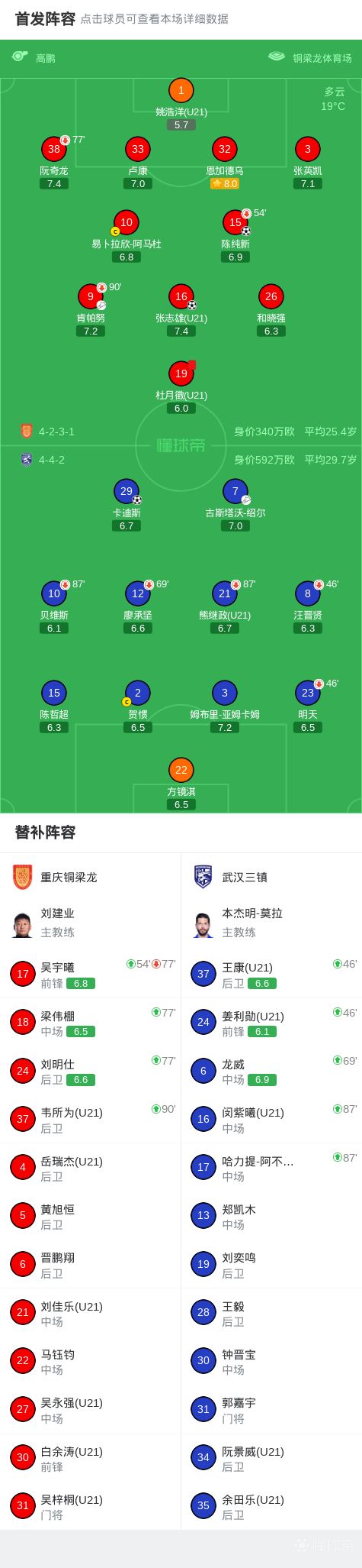 北京时间4月11日中国足球超级联赛第5轮,重庆铜梁龙主场对阵武汉三镇。重庆铜梁龙陈纯新、张志雄分别破门,杜月徵染红。卡迪斯扳回一城。最终比分重庆铜梁龙2-1武汉三镇。