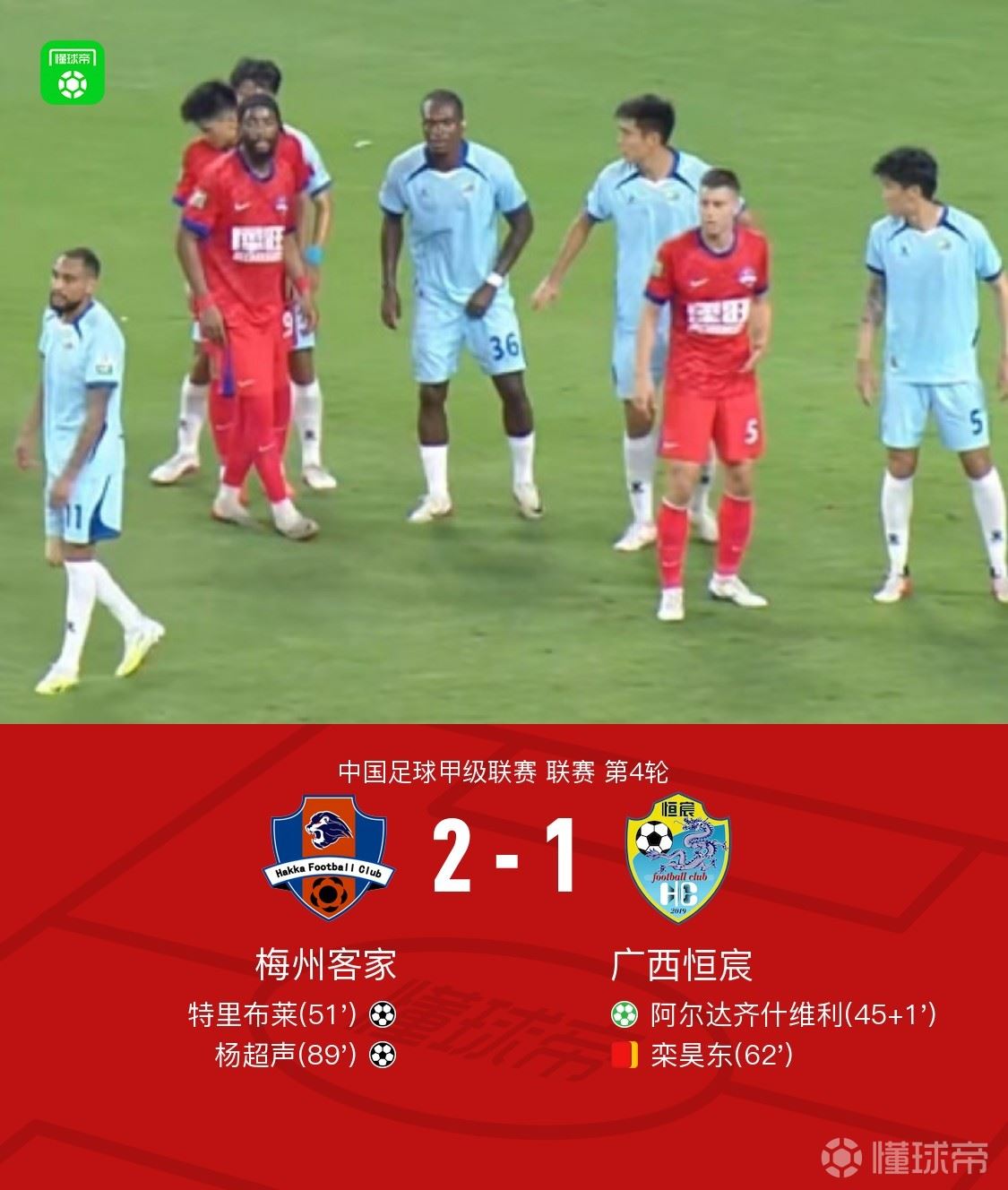北京时间4月11日中国足球甲级联赛 联赛 第4轮,梅州客家主场对阵广西恒宸。梅州客家特里布莱破门,杨超声破门。广西恒宸阿尔达齐什维利破门。最终比分梅州客家 2-1 广西恒宸。