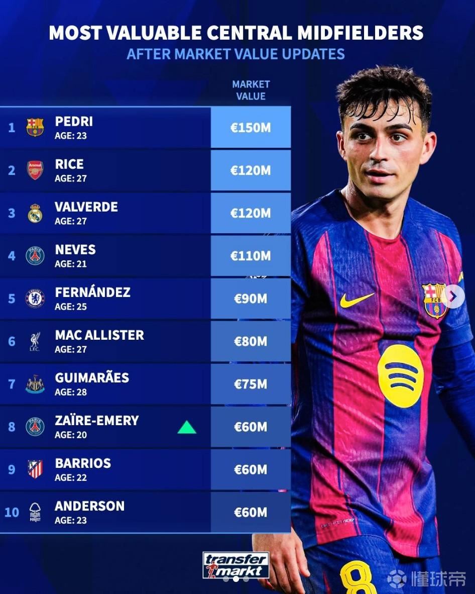 北京时间4月12日,德转列出了世界足坛中前卫球员身价前10,巴塞罗那的佩德里以1.5亿欧元高居第一,阿森纳的赖斯和皇家马德里的巴尔韦德同以1.2亿欧元并列第二。