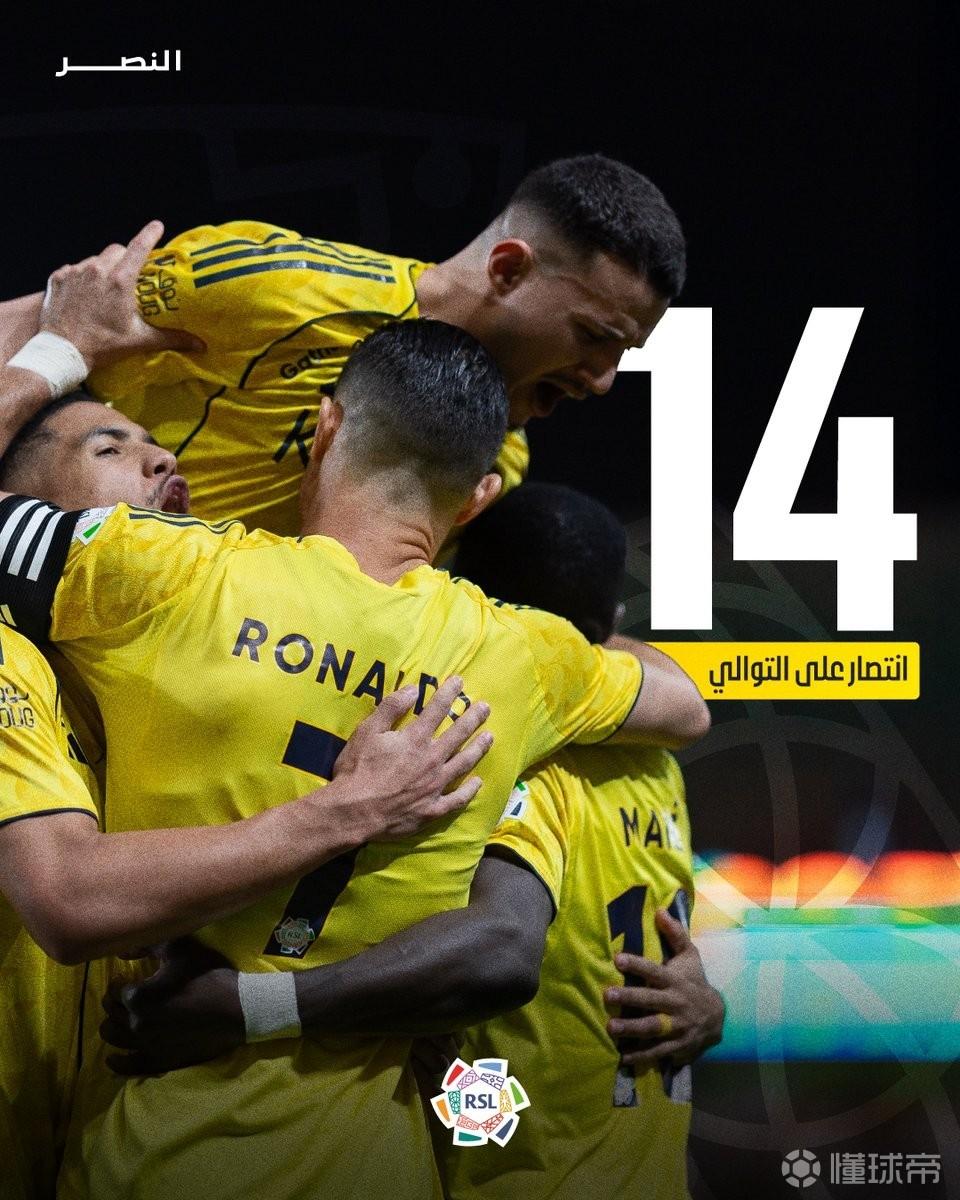 沙特联赛第28轮,利雅得胜利客场2-0击败阿科多,豪取联赛14连胜,创下队史职业联赛最长连胜纪录。