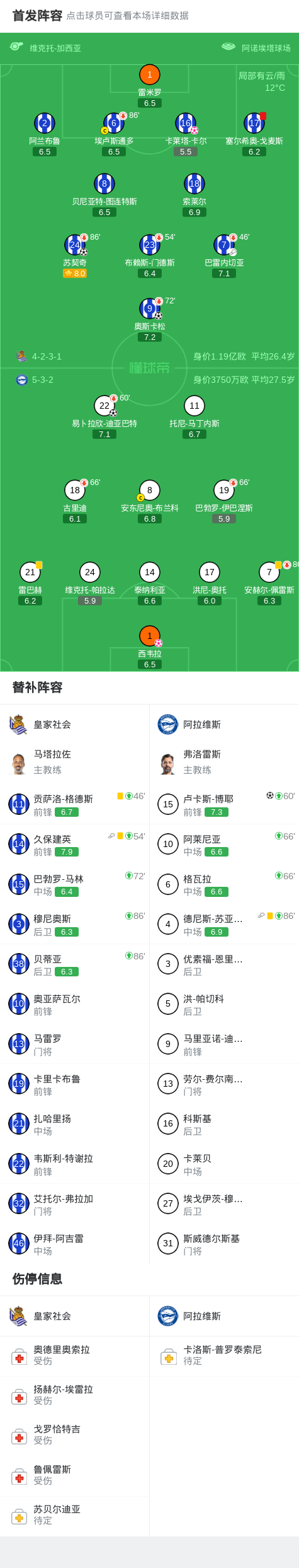 北京时间4月11日西班牙足球甲级联赛 联赛 第31轮,皇家社会主场对阵阿拉维斯。皇家社会苏契奇破门,奥斯卡松破门,卡莱塔-卡尔自摆乌龙。阿拉维斯易卜拉欣-迪亚巴特破门,卢卡斯-博耶破门,西韦拉自摆乌龙。最终比分皇家社会 3-3 阿拉维斯。