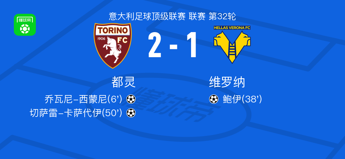 北京时间4月11日意大利足球顶级联赛 联赛 第32轮,都灵主场对阵维罗纳。都灵乔瓦尼-西蒙尼破门,切萨雷-卡萨代伊破门。维罗纳鲍伊破门。最终比分都灵 2-1 维罗纳。