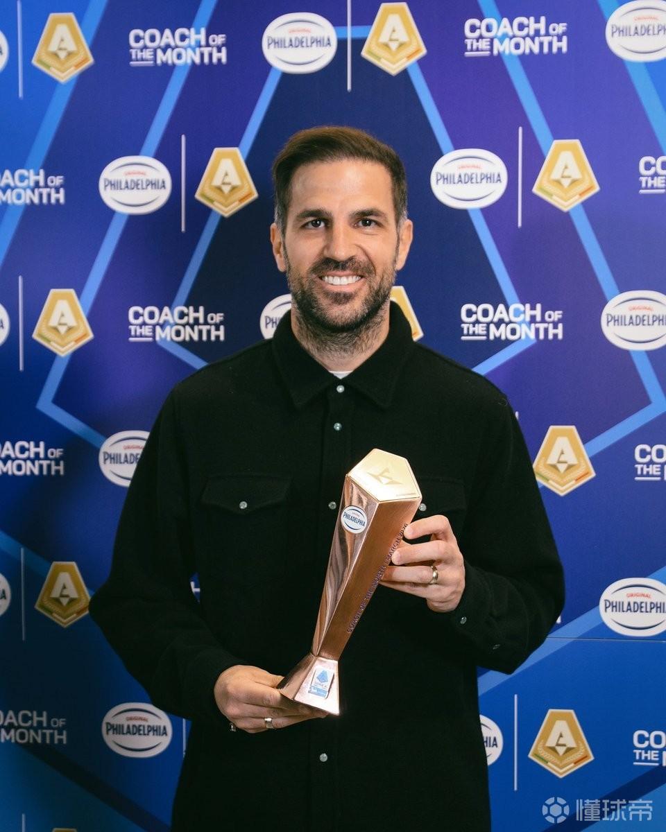北京时间4月13日,在意甲第32轮科莫主场与国际米兰的比赛开始前,法布雷加斯领取了意甲3月最佳教练的奖杯。