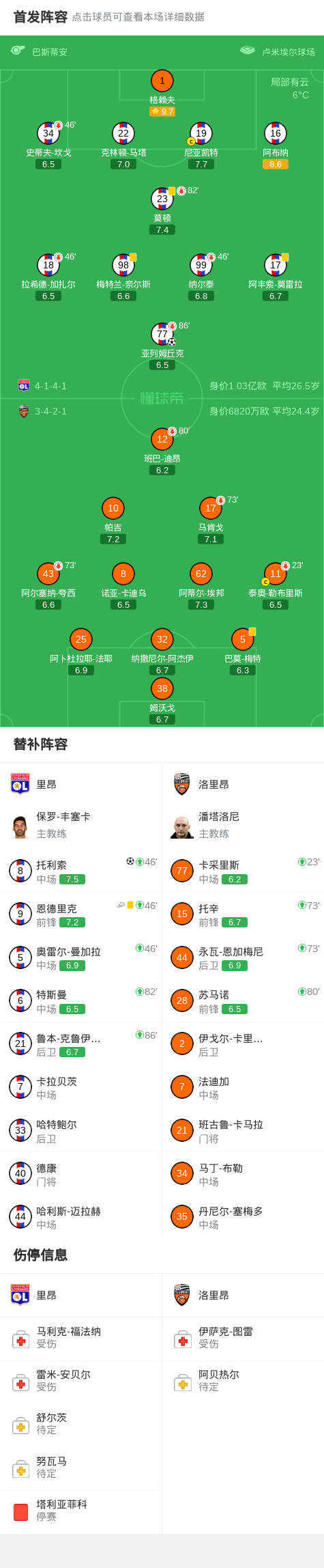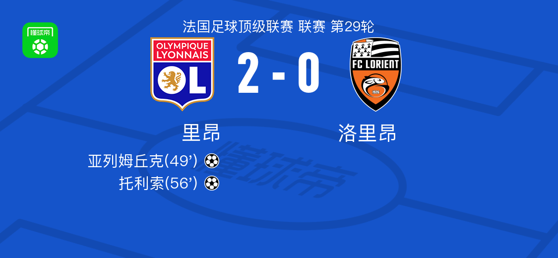 北京时间4月13日法国足球顶级联赛 联赛 第29轮,里昂主场对阵洛里昂。里昂亚列姆丘克破门,托利索破门。最终比分里昂 2-0 洛里昂。