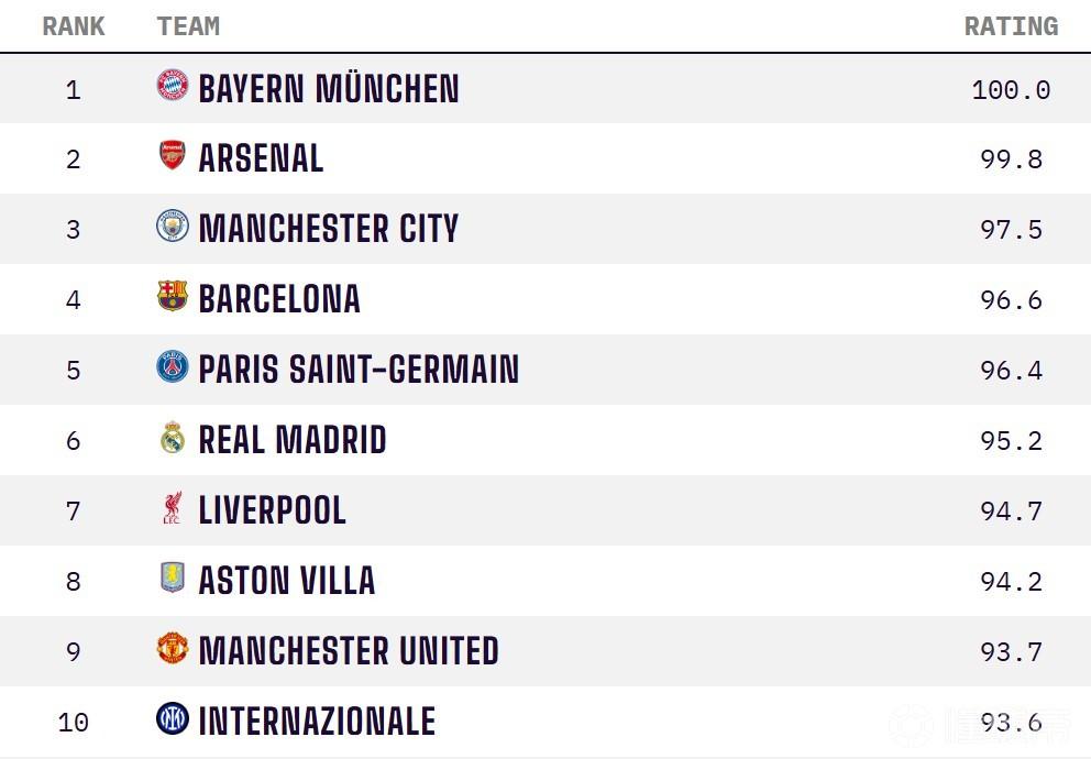 4月13日,数据平台Opta更新了本期全球俱乐部实力榜。德甲豪门拜仁位列榜首,阿森纳下降1位暂列次席,前十中英超球队共占5席,国米成为实力榜前十唯一的意甲球队。