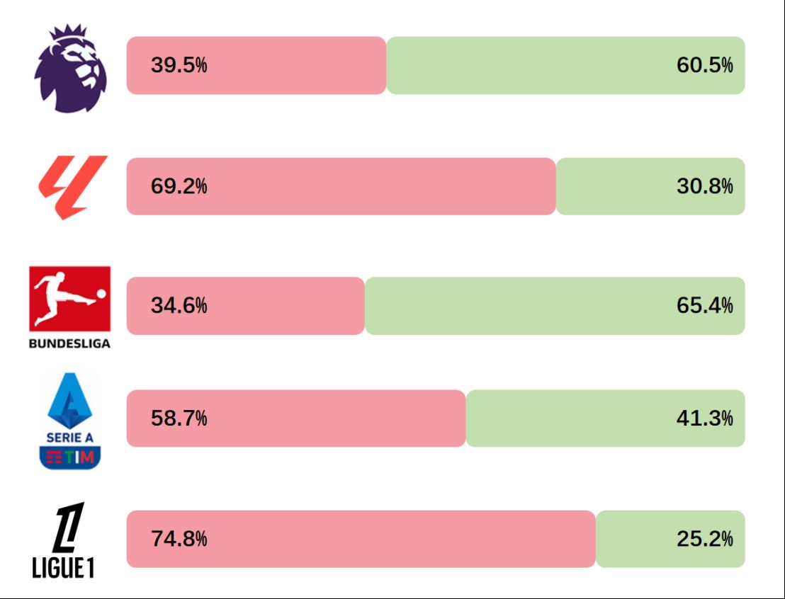 截至发文时间,2025/26赛季五大联赛在北京时间0点前后的开赛场次比例(红色代表对中国球迷不太友好的0点后晚场时间,绿色代表对中国球迷相对友好的0点前早场时间)