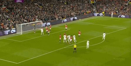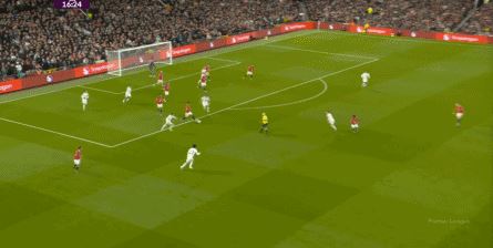这一点还没完,第29分钟,利兹联先是在前场用身体抢断布鲁诺,获得了可以继续比赛的许可,大范围转移到右路之后,直接用45度长传打到了门前: