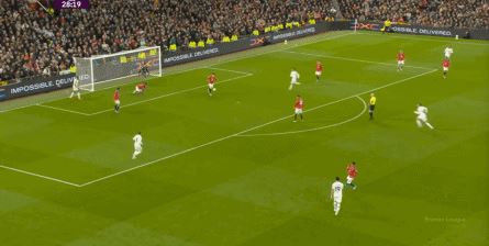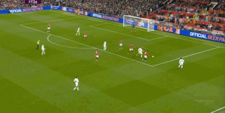 利桑德罗-马丁内斯拿下来,选择直传卡塞米罗,他可能也懵了,分不清当时的局势是可以冒险,还是稳妥为好了,但有一点是确定的,此前就在连续失误的卡塞米罗,身体肯定是跟不上了,所以他被利兹联的后续逼抢直接断掉,防守压力因此延续下去: