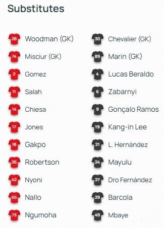 替补:28-伍德曼、74-米舍尔、2-乔-戈麦斯、11-萨拉赫、14-费代里科-基耶萨、17-柯蒂斯-琼斯、18-加克波、26-罗伯逊、42-尼奥尼、65-阿马拉-纳洛、73-恩古莫哈