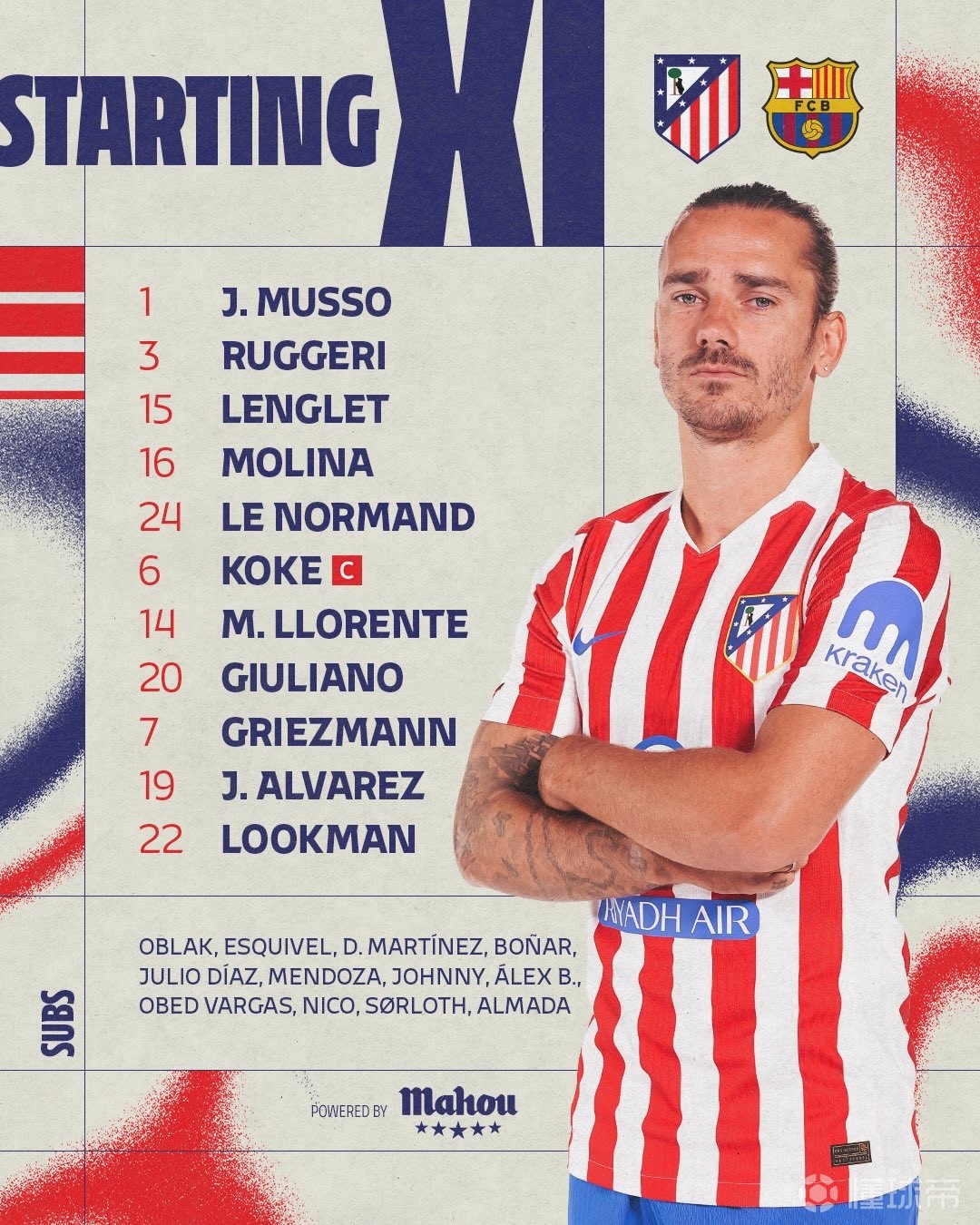 马德里竞技首发:1-穆索、16-莫利纳、15-朗格莱、24-勒诺尔芒、3-鲁杰里、6-科克、14-马科斯-略伦特、20-朱利亚诺-西蒙尼、22-卢克曼、19-胡利安-阿尔瓦雷斯、7-格列兹曼