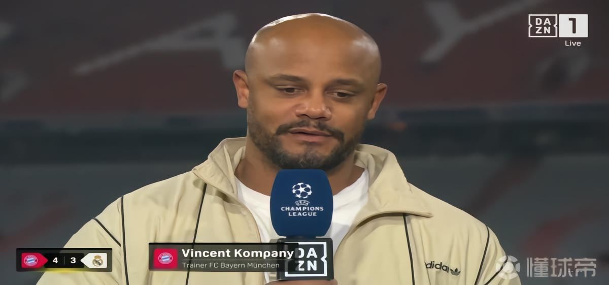 欧冠1/4决赛,拜仁慕尼黑总比分6-4淘汰皇家马德里晋级,赛后,拜仁主帅孔帕尼在接受DAZN采访时谈到了他将因累计三黄停赛缺席半决赛首回合的话题。