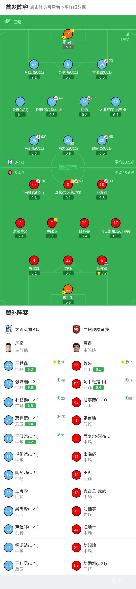 北京时间4月11日中国足球乙级联赛 预赛阶段 第3轮,大连英博B队主场对阵兰州陇原竞技。上半场张俊哲门前将球撞进球门。下半场刘逸造点,肖力荣主罚命中。最终比分大连英博B队 1-1 兰州陇原竞技。