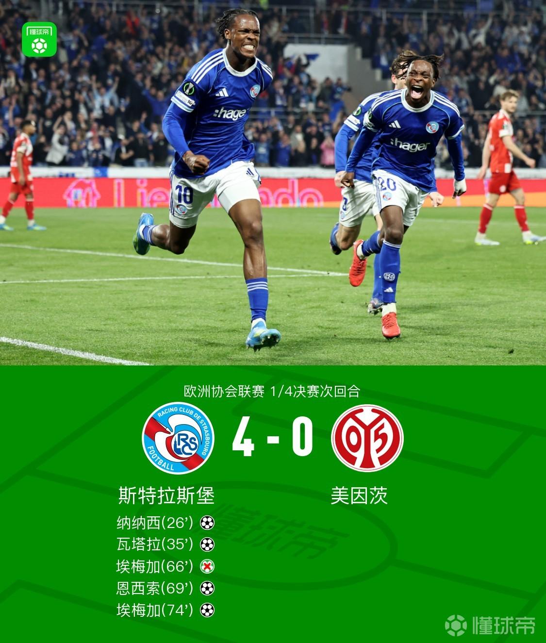 北京时间4月17日欧洲协会联赛 1/4决赛次回合,斯特拉斯堡对阵美因茨。上半场纳纳西首开记录,瓦塔拉破门扩大领先优势,下半场巴尔科造点埃梅加主罚点球被扑出,恩西索破门再下一城,埃梅加进球锁定胜局。最终比分斯特拉斯堡 4-0 美因茨。两回合总比分斯特拉斯堡4-2美因茨晋级4强。