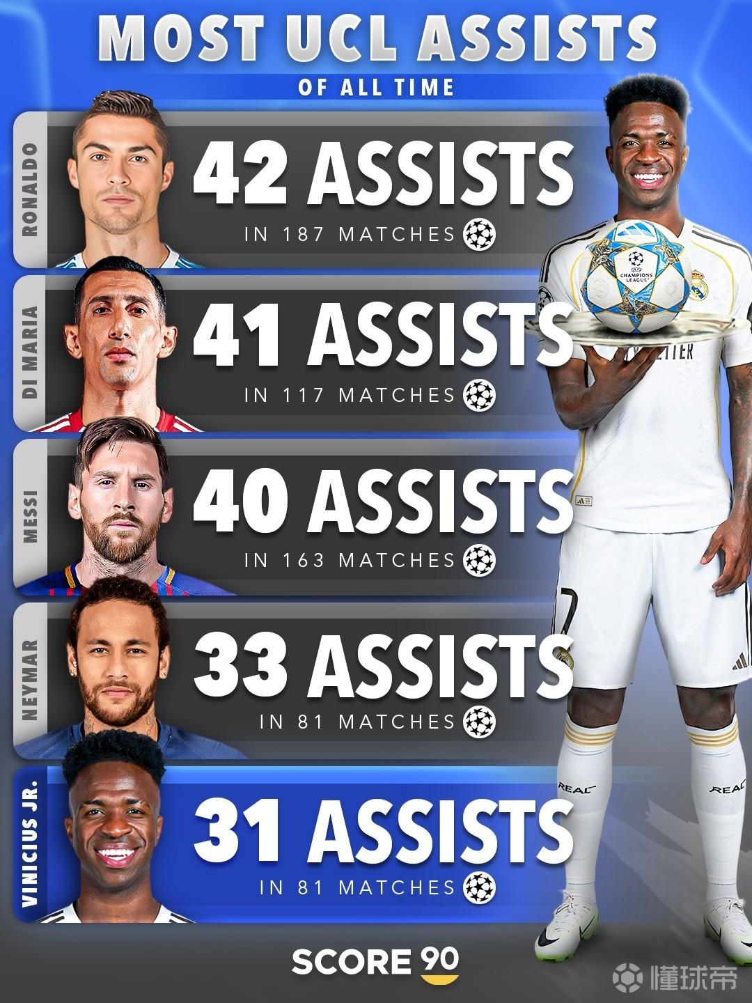 根据统计,到目前为止,维尼修斯已经在欧冠当中送出了31记助攻,位列欧冠历史助攻榜第5名。