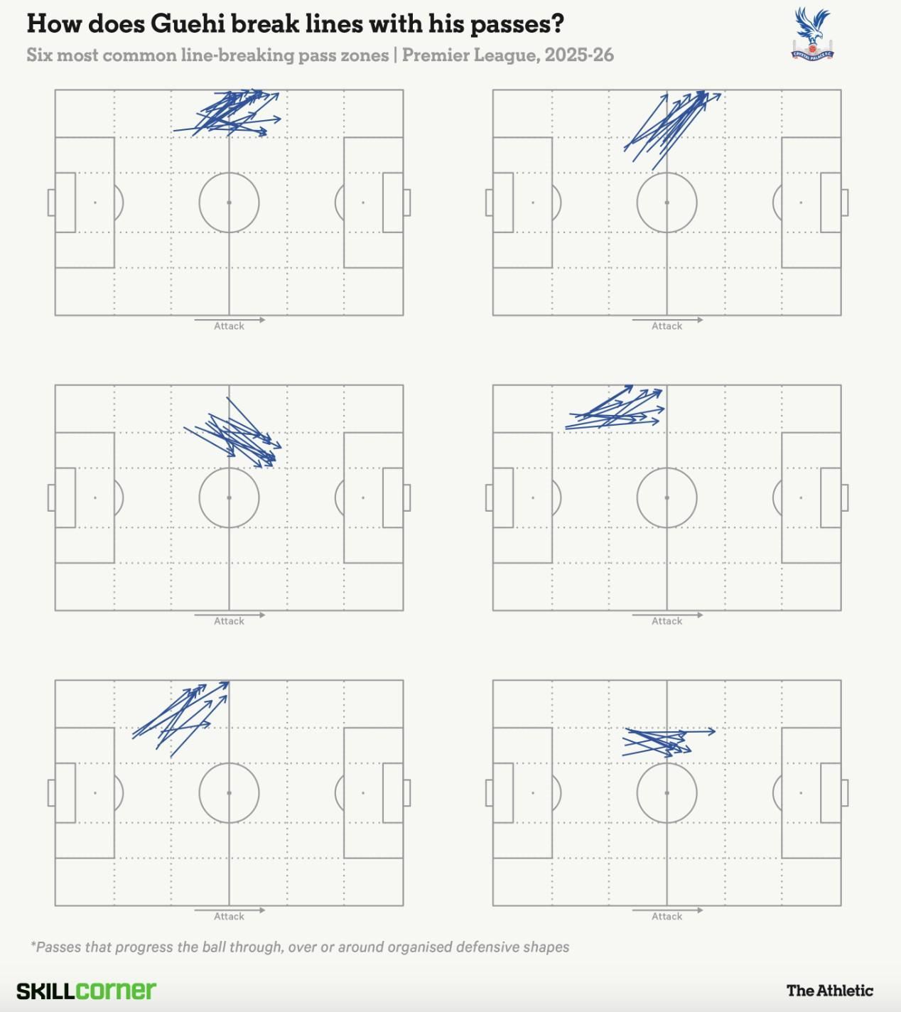 在水晶宫,格伊经常出现在三中卫体系中的左中卫位置。他的很多向前传球,都会分到边路,让米切尔在翼卫位置上拉开空间。不过,随着他在面对阵地防守时获得更多触球机会,我们已经看到他在“穿透性向前传球”方面具备进一步提升的潜力——他完全有能力用双脚在中路关键区域找到队友。