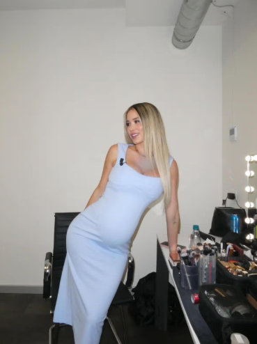 接下来的照片印证了这一点,迪莱塔戴着同一条项链,身穿一条紧身浅蓝色连衣裙,孕肚十分显眼。