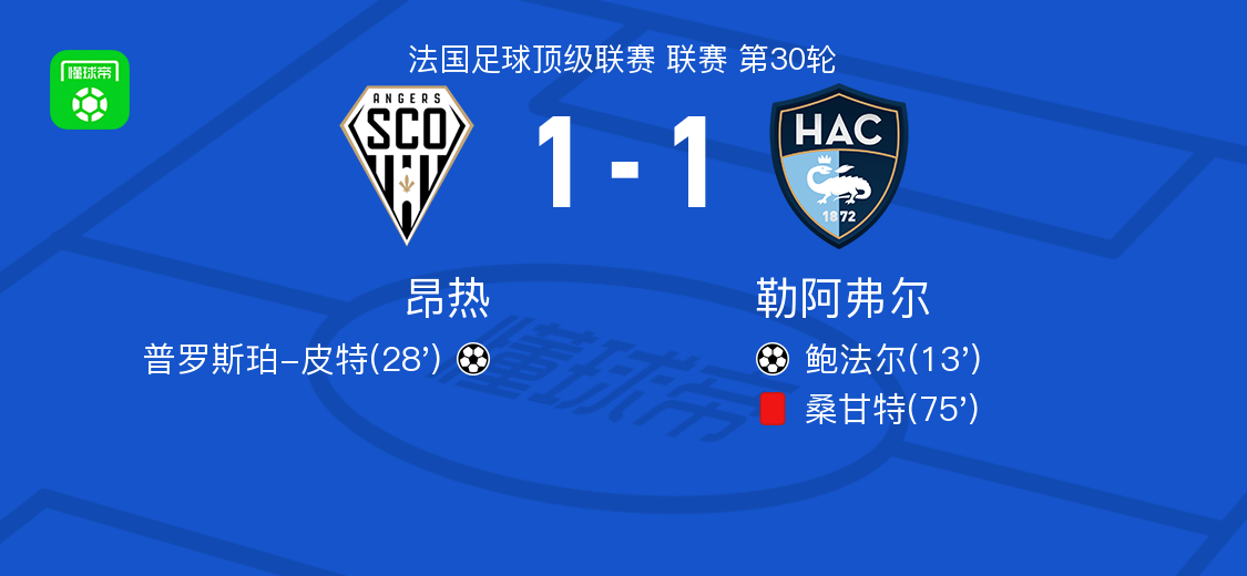 北京时间4月19日法国足球甲级联赛第30轮,昂热主场迎战勒阿弗尔。比赛中,勒阿弗尔球员先凭借一次助攻由鲍法尔打入一球取得领先;随后昂热球员通过助攻帮助普罗斯珀-皮特破门扳平比分;下半场勒阿弗尔一名球员吃到红牌。最终两队1-1握手言和,昂热1-1勒阿弗尔。