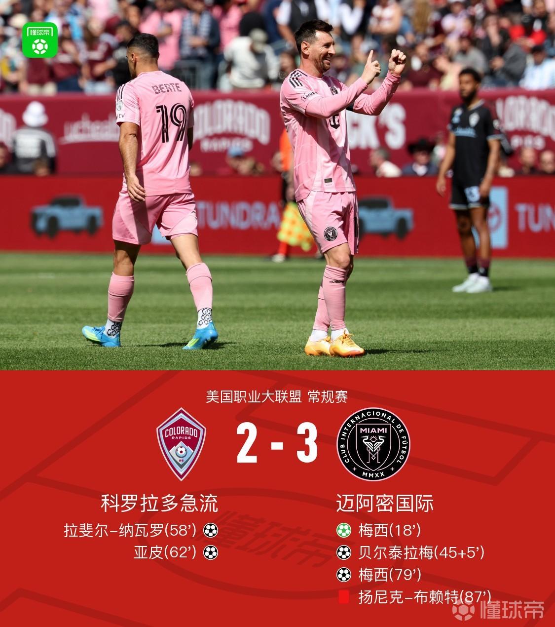 北京时间4月19日美国职业大联盟 常规赛,科罗拉多急流主场对阵迈阿密国际。上半场,布赖特造点,梅西主罚点球命中。西尔维蒂传中,贝尔泰拉梅头球破门。下半场,拉斐尔-纳瓦罗、亚皮接连进球将比分扳平。德保罗助攻,梅西禁区右侧兜射远角破门再次超出比分。布赖特犯规并言语攻击,裁判直红将其罚下。最终,迈阿密国际客场3-2战胜科罗拉多急流。