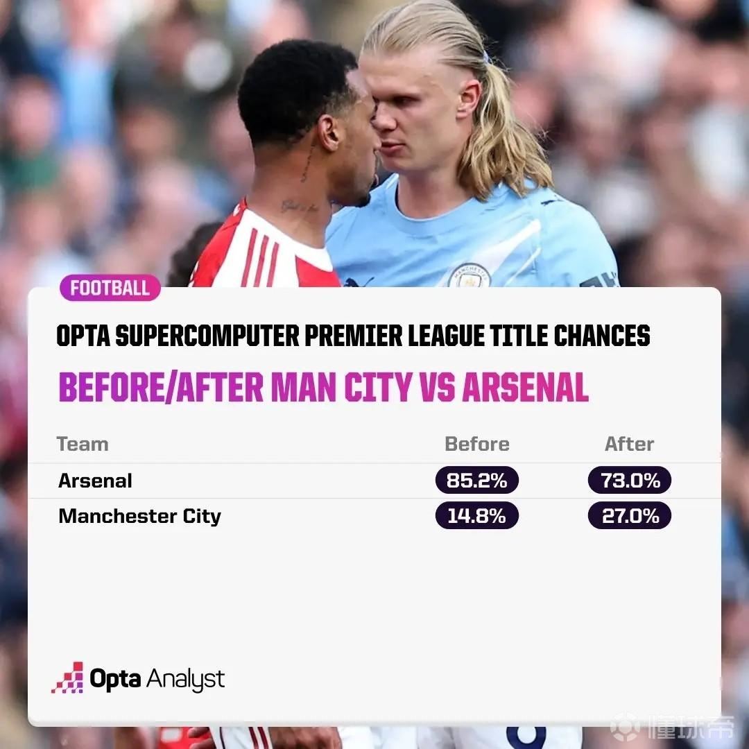 然而,Opta的超级计算机却给出了一个有些“反直觉”的概率预测。数据显示,在本场比赛开始前,阿森纳的夺冠概率为85.2%,曼城则为14.8%;而本场比赛结束后,阿森纳的夺冠概率降至73%,曼城的夺冠概率上升至27%,阿森纳的夺冠概率依旧远超曼城。