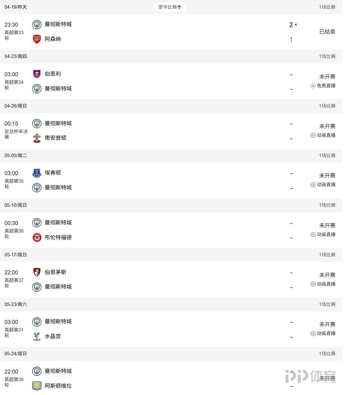 曼城少赛1场落后3分,曼城与阿森纳剩余的联赛赛程如图: