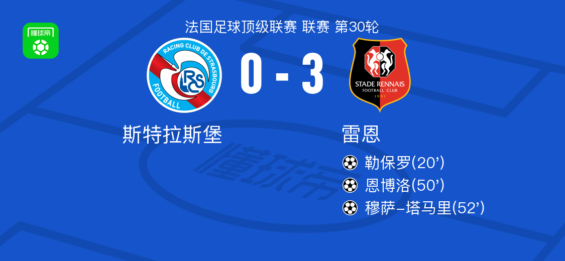 北京时间4月19日法国足球甲级联赛第30轮,斯特拉斯堡主场对阵雷恩。比赛中,勒保罗率先破门,随后恩博洛打入进球,穆萨-塔马里也完成得分。最终比分斯特拉斯堡0-3雷恩。