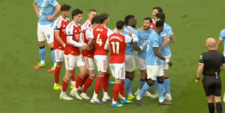 罗德里冲过来对着加布里埃尔怒吼,双方球员一拥而上互相推搡。幸运的是,双方球员很快恢复了冷静,主裁判向哈兰德、加布里埃尔出示了黄牌。