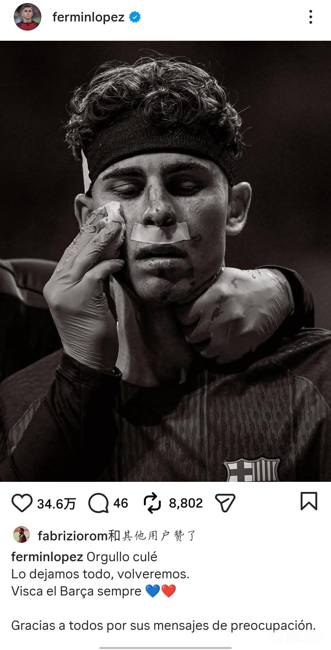 北京时间4月15日,欧冠1/4决赛次回合比赛,巴萨客场2-1马竞,总比分2-3不敌马竞无缘欧冠四强。赛后费尔明在社媒晒脸部受伤照并发文:“身为巴萨球迷的骄傲。我们付出了一切,我们会回来的。巴萨永远万岁。感谢大家发来的关心的消息。”