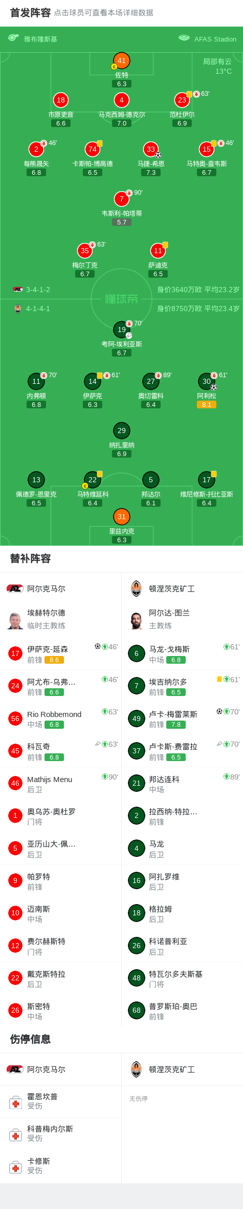 北京时间4月17日欧洲协会联赛 1/4决赛次回合,阿尔克马尔对阵顿涅茨克矿工。阿尔克马尔伊萨克-延森破门,马捷-希恩破门。顿涅茨克矿工阿利松破门,卢卡-梅雷莱斯破门。最终比分阿尔克马尔 2-2 顿涅茨克矿工。两回合总比分阿尔克马尔2-5顿涅茨克矿工。