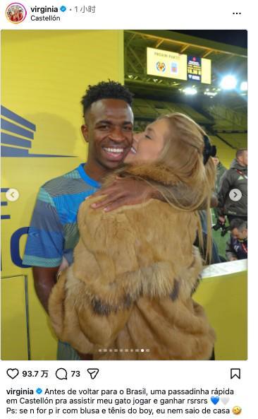 同时也晒出了和维尼修斯在赛后的合影,维尼修斯女友弗吉尼亚是巴西国内颇有影响力的网红,在社交媒体上拥有超过5000万粉丝。