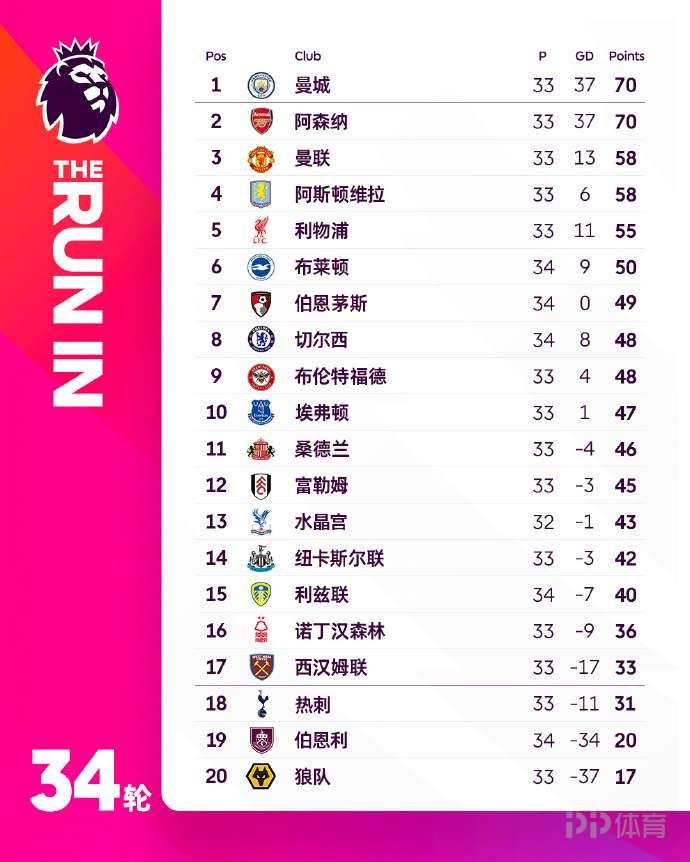 此役后,曼城积70分追平阿森纳,两队均赛33场的情况下,净胜球都是37个,曼城进球数66,阿森纳进球数63,因此曼城登顶!