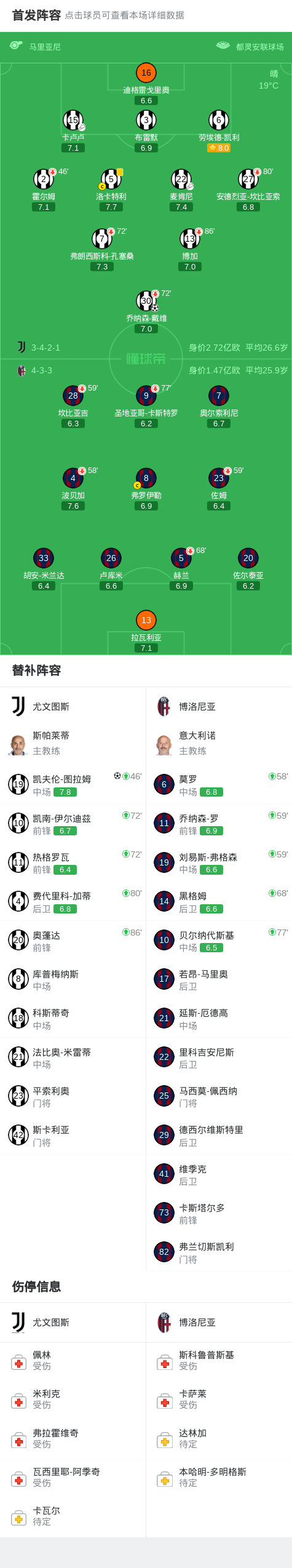 北京时间4月20日2:45,意甲第33轮,尤文图斯主场对阵博洛尼亚。上半场,乔纳森-戴维头球破门,孔塞桑破门被吹越位在先,进球无效,随后孔塞桑禁区内小角度推射被门将挡出,霍尔姆抽射击中门框。下半场,凯夫伦-图拉姆头球破门,最终,尤文2-0战胜博洛尼亚。