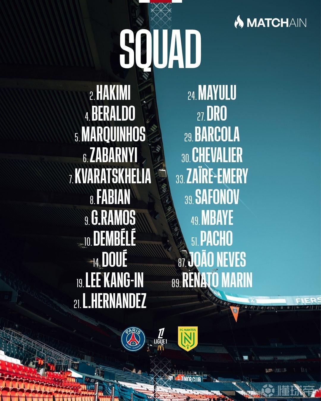 北京时间4月23日凌晨1点,法甲第26轮,巴黎将在主场迎战南特。赛前,巴黎官方公布了球队本场比赛的大名单。