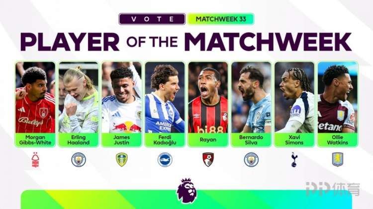 今天,英超联赛在官网公布了2025/26赛季英超第33轮最佳球员候选,哈兰德、B席、沃特金斯等8位球员在列。