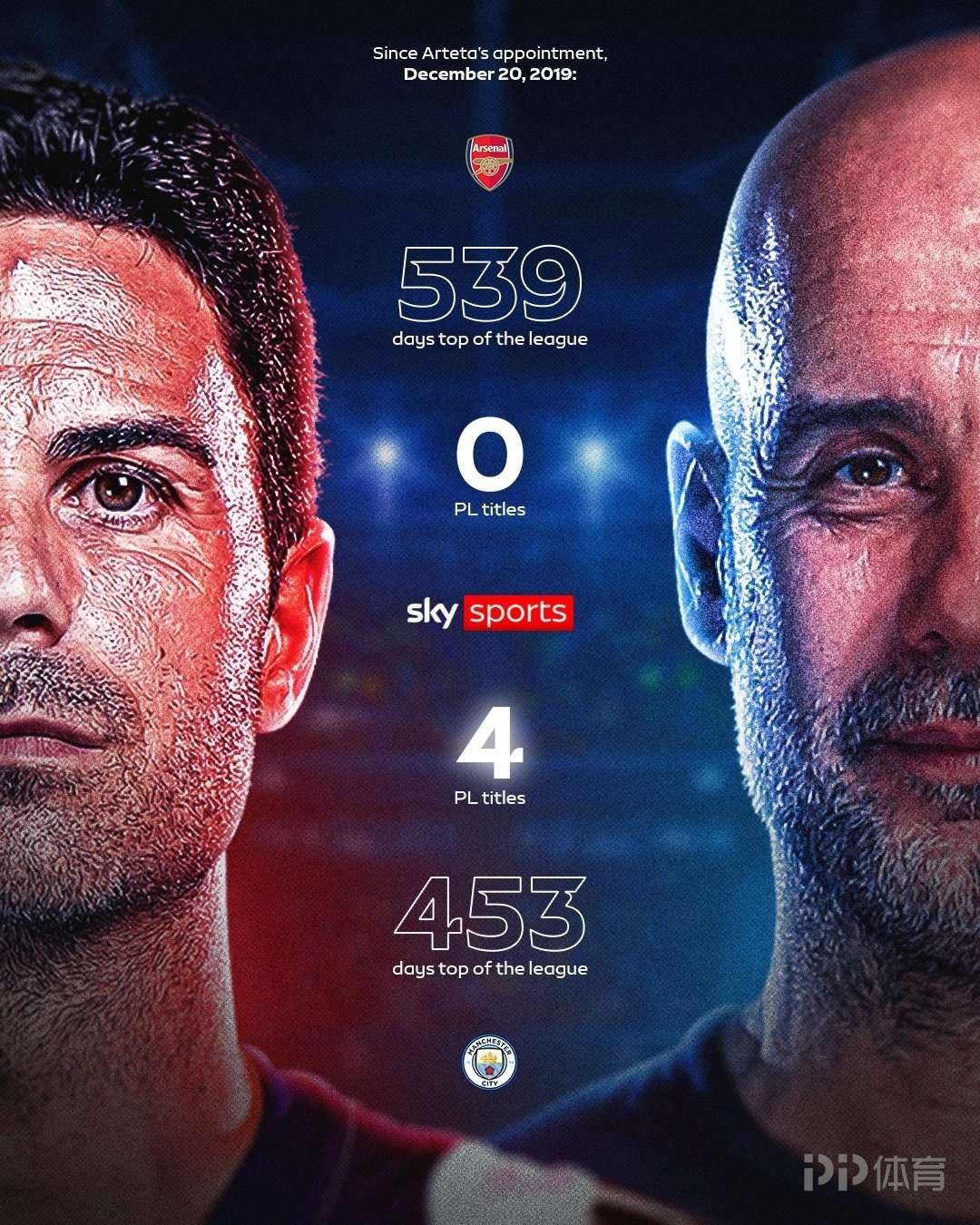 据天空体育的统计,自阿尔特塔执教以来,阿森纳已经539天领跑英超,而瓜迪奥拉的曼城只有453天的时间在榜首,可是在此期间曼城拿了4次英超冠军,阿森纳却颗粒无收。