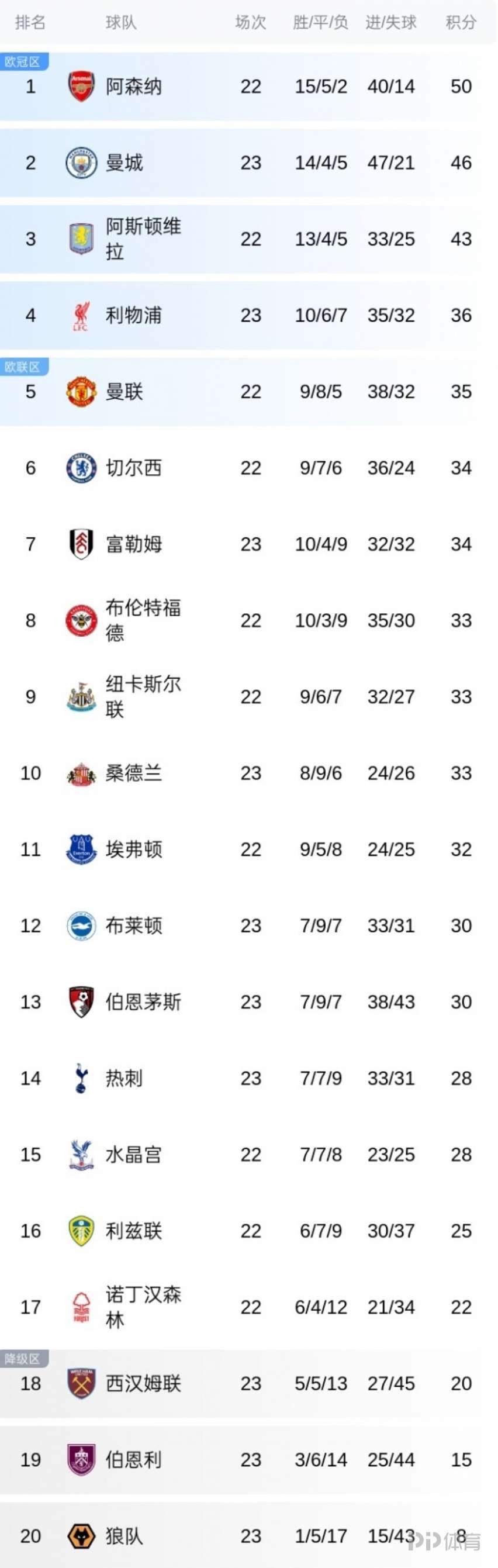 英超第23轮,利物浦2-3遭伯恩茅斯读秒绝杀,积分榜上利物浦先赛积36分,仍居第四,明日凌晨的焦点战阿森纳将对阵曼联。