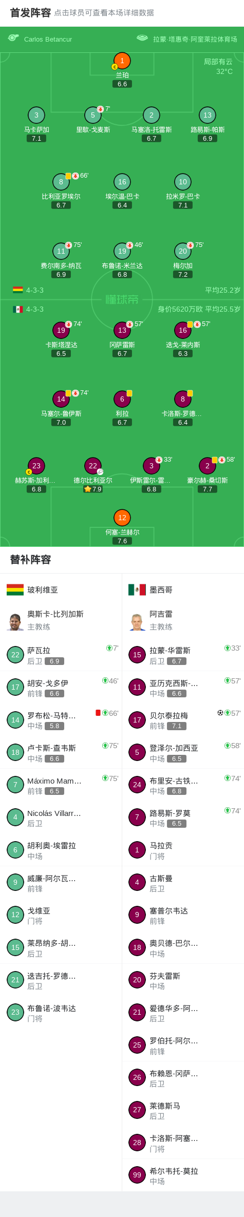 国际友谊赛,玻利维亚对阵墨西哥。德尔比利亚尔送出助攻,贝尔泰拉梅破门得分。罗布松-马特乌斯被罚出场。最终比分玻利维亚0–1墨西哥。