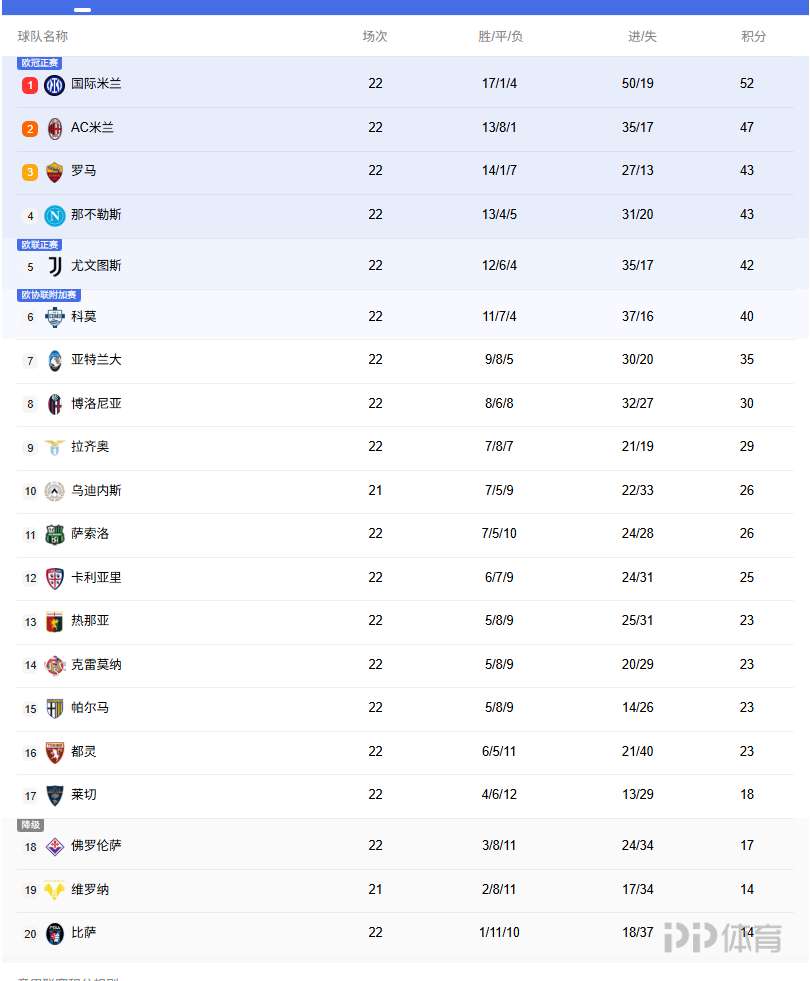 本轮意甲,米兰1-1战平罗马,尤文3-0大胜那不勒斯。目前国米52分第一,米兰近5轮3平,目前他们47分第二。罗马、那不勒斯43分排名第三和第四。尤文在本轮大胜后紧追前四,只有1分差距。