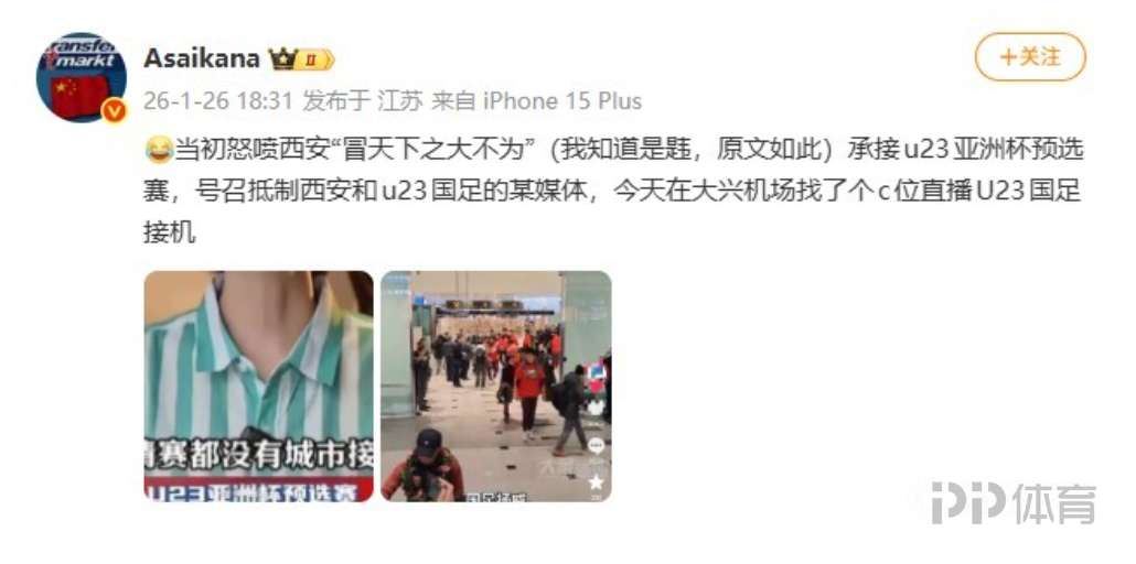 德转中国区管理员朱艺挖出了此前媒体喷西安“冒天下之大不为(韪,此处为朱艺有意为之)”承接U23亚洲杯预选赛、号召抵制西安和U23国足的言论,结果在今天国足将士返回时,该媒体还在北京大兴机场找了个“C位”直播接机U23国足将士。