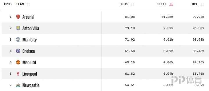 英超第23轮全部结束,知名数据网站Opta更新了最新的英超夺冠概率。目前阿森纳以81.28%概率排在第1,维拉和曼城排在二三位。