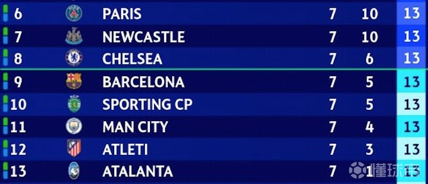 欧冠联赛阶段最后一轮18场同开,赛前6-13名的八支球队同积13分,对前八的直通名额展开了激烈争夺。不过半场过后,八支球队里仅曼城取得了领先。