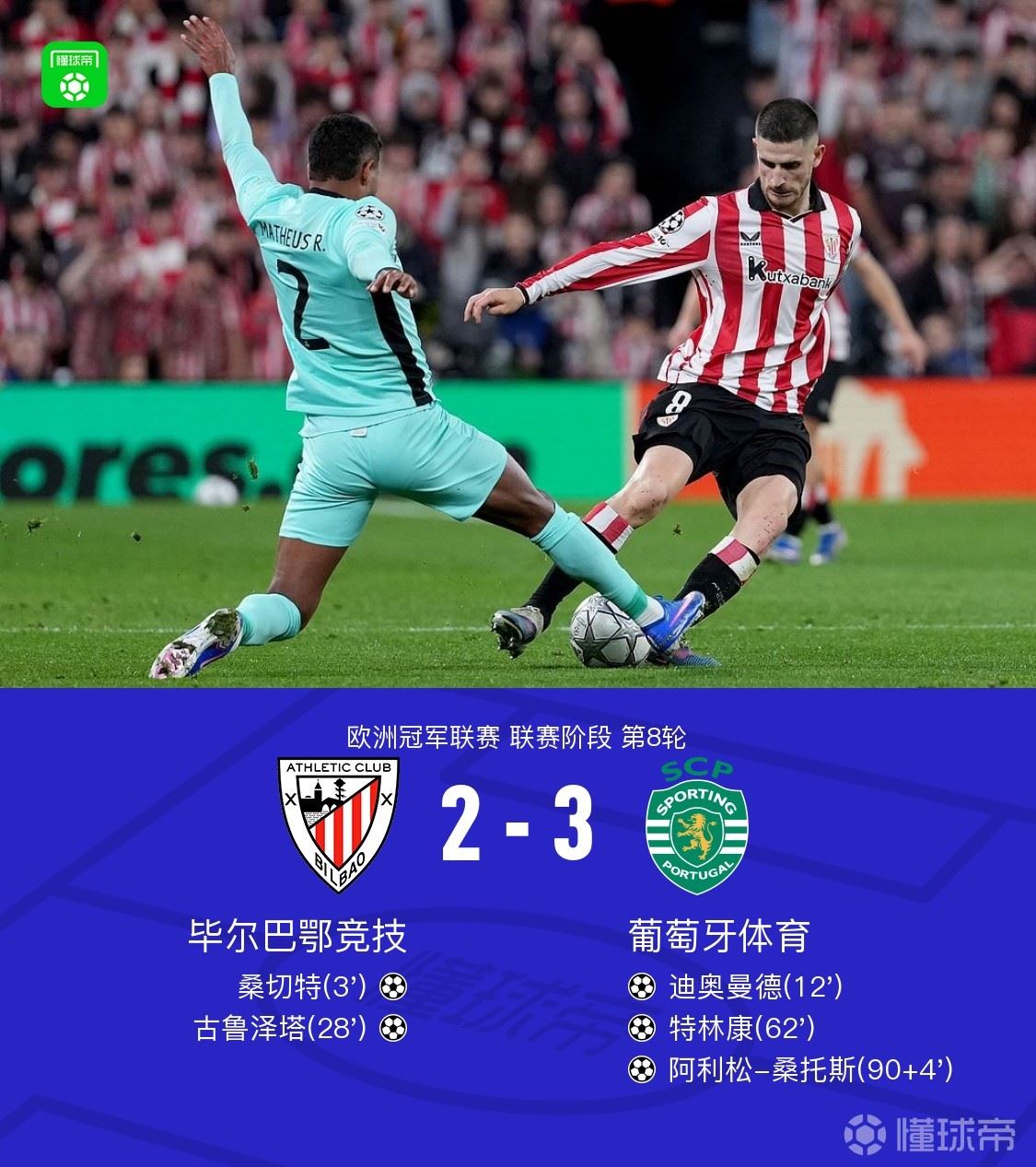北京时间1月29日欧洲冠军联赛 联赛阶段 第8轮,毕尔巴鄂竞技对阵葡萄牙体育。毕尔巴鄂竞技桑切特破门,古鲁泽塔破门。葡萄牙体育迪奥曼德破门,特林康破门,阿利松-桑托斯破门。最终比分毕尔巴鄂竞技 2-3 葡萄牙体育,无缘下一阶段。葡萄牙体育以第七名的成绩晋级下一阶段的比赛。
