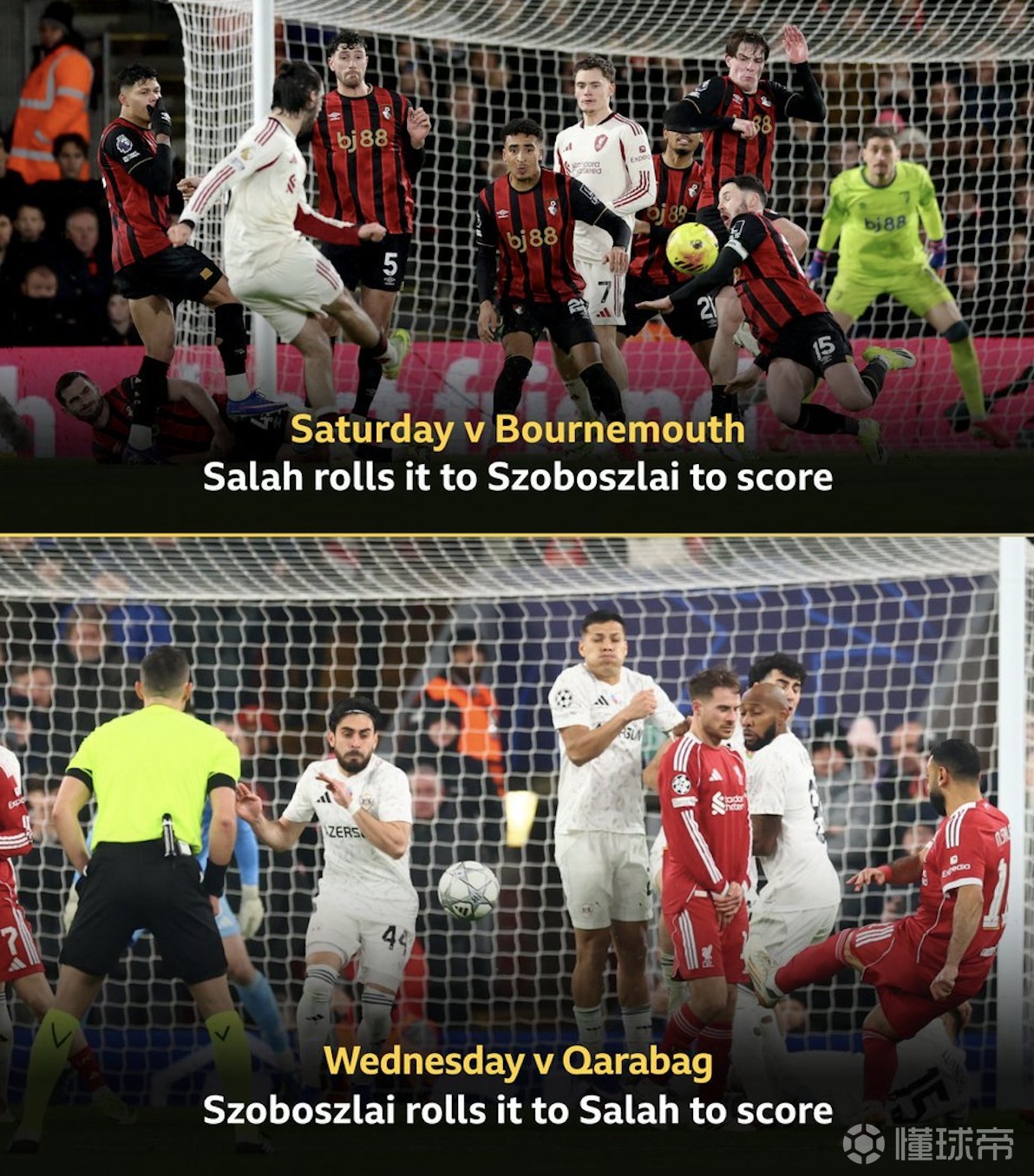 欧冠联赛阶段第8轮,利物浦主场对阵卡拉巴赫,下半场索博斯洛伊助攻萨拉赫破门,两人连续两场比赛通过战术任意球互相助攻。