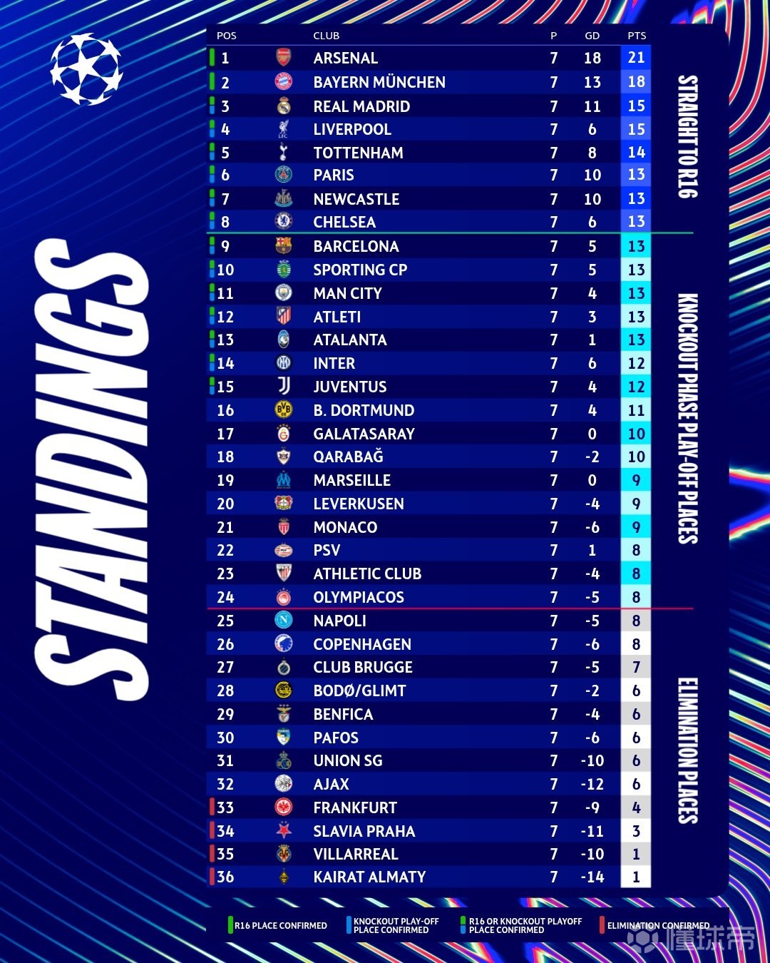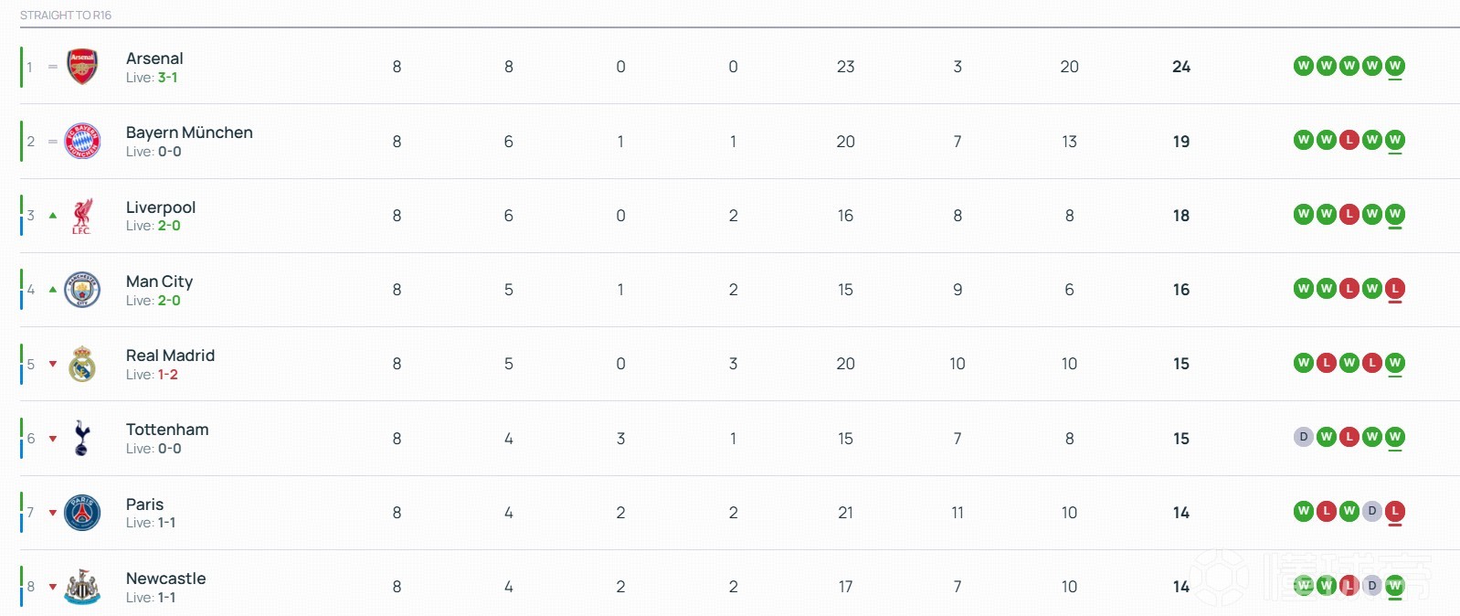 北京时间1月29日,欧冠联赛阶段最后一轮18场比赛全部结束了上半场的争夺。上半场结束后,曼城进入前八名,切尔西掉出前八名。西甲双雄皇马、巴萨目前都暂时落后,分别掉至第5和第13。