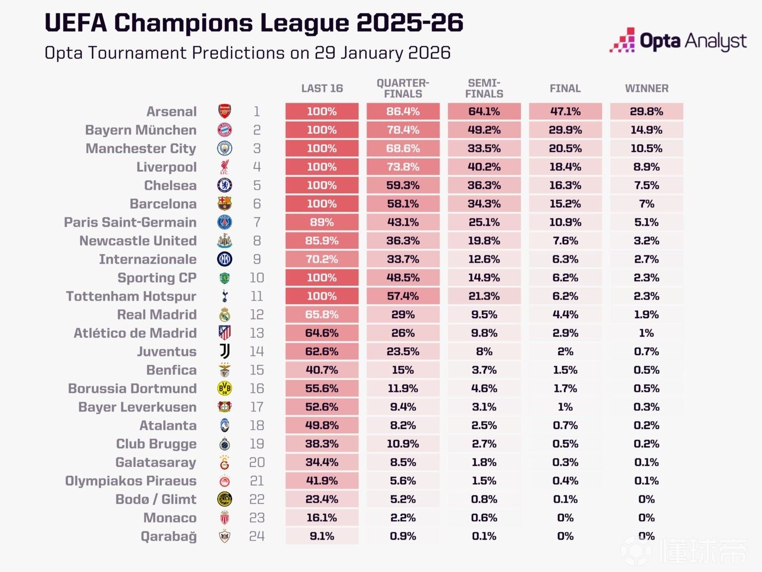欧冠已经结束联赛阶段的争夺,8队直接晋级16强,16队将打淘汰赛附加赛,知名数据机构Opta更新了各队的夺冠概率。
