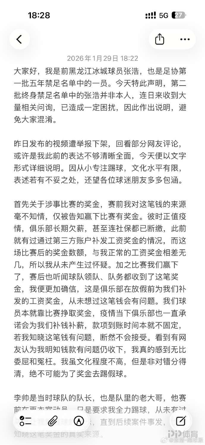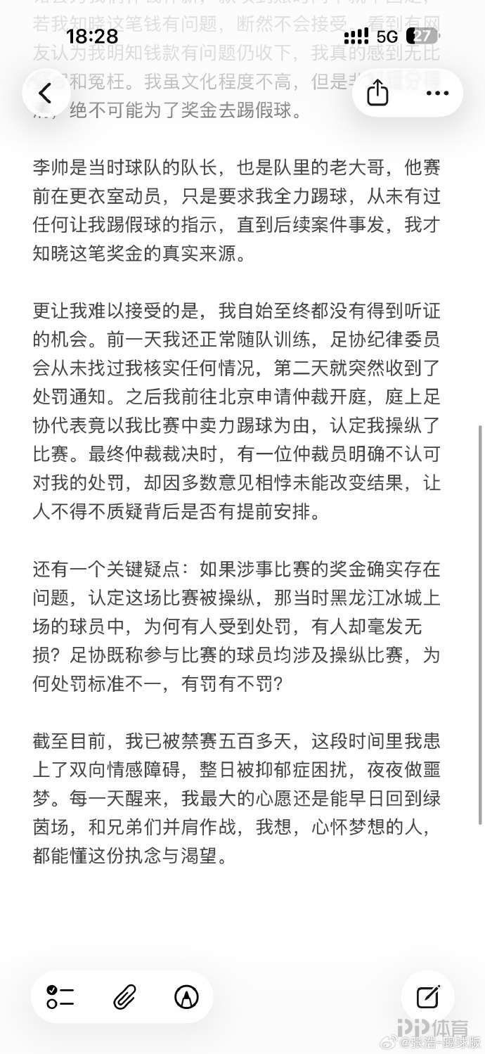 前黑龙江冰城球员张浩发文,表示今日终身禁足名单中的张浩并非是自己(终身禁足的张浩为原石家庄功夫球员),自己在被禁赛后整日被抑郁症困扰。