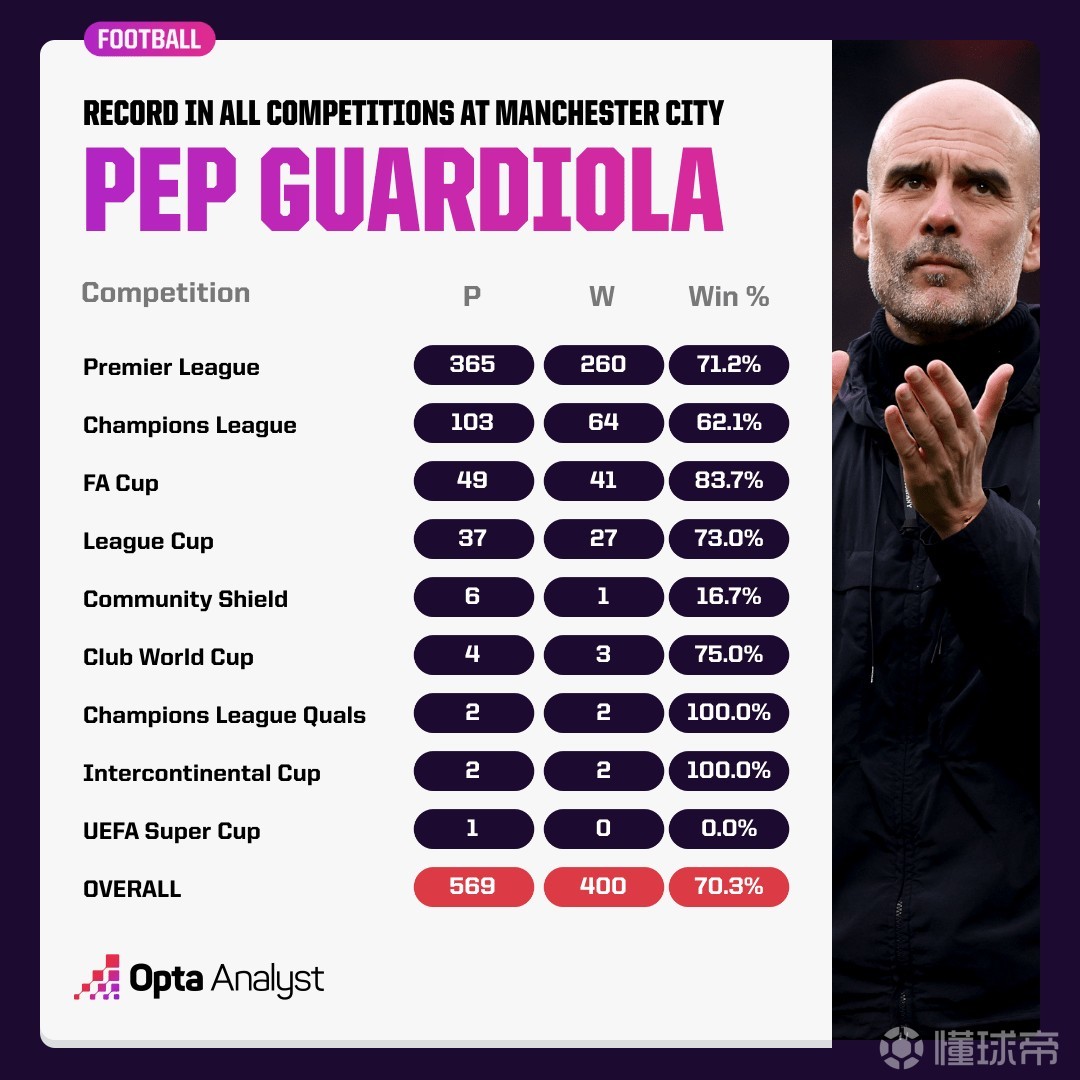 据统计,瓜迪奥拉在曼城只用569场比赛便取得400胜,使得他超越阿森纳传奇教练温格,成为率领一支英格兰顶级联赛球队最快赢得400场正式比赛胜利的主教练。