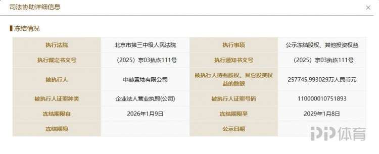 信息显示,该冻结期限自2026年1月9日至2029年1月8日,共1095天。被执行人持有股权、其它投资权益的数额为257745.993029万元人民币。