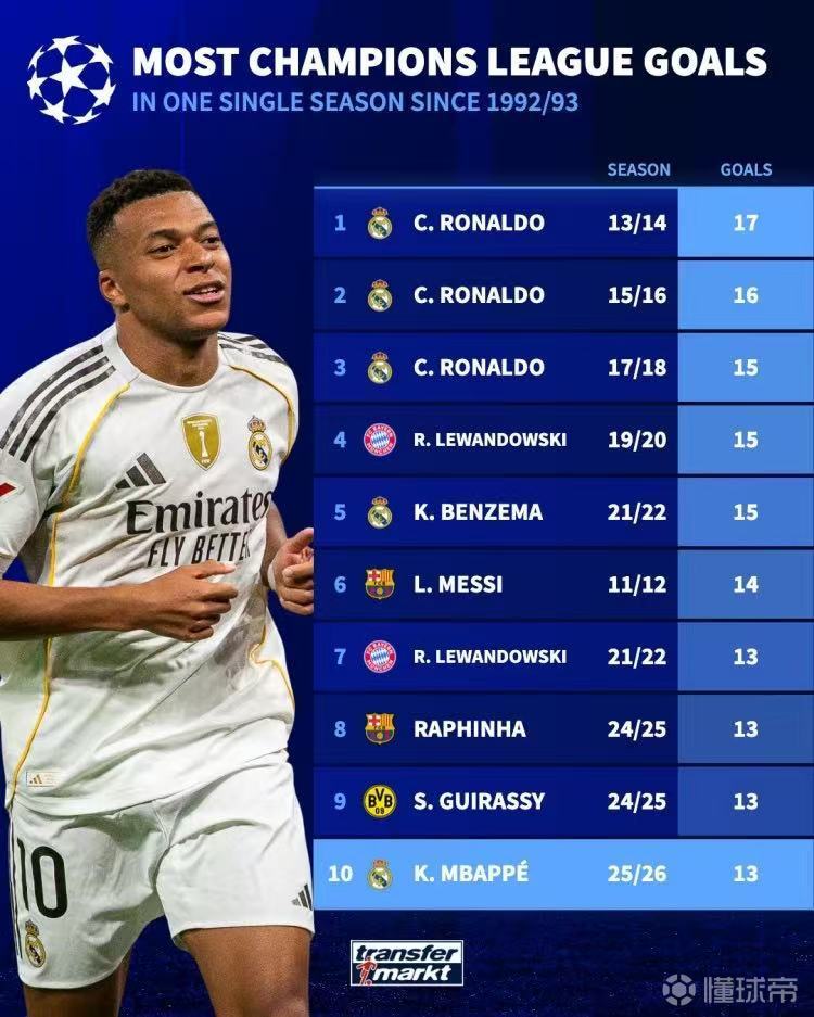 你认同吗?据最新统计,本赛季姆巴佩的欧冠进球数已经来到13个,很有可能打破C罗的单赛季进球纪录。但也有不少球迷认为这对欧冠之王C罗不够公平,再次改制后的欧冠应该重新计算及进球纪录。
