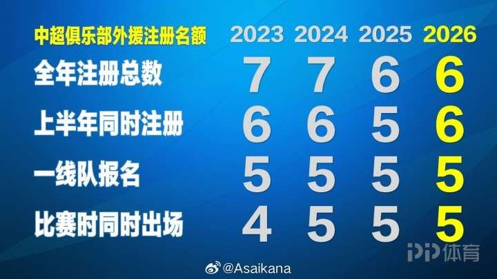 第一个“6”没有变化,代表俱乐部全年外援注册总数为6个,即球队一年注册的外援注册总量最多为6人,凡是与球队签订有工作合同的外援都需要注册,包括租出和租入的外援。全年注册总数包括上半赛季初始报名的外援和夏转期间调整的总和。注意,注册数不存在“撤销”这一概念,外援一旦注册,就占据本队本赛季1个名额,不会因为外援在赛季中转出球队、撤下一线队名单而“让出”1个名额。